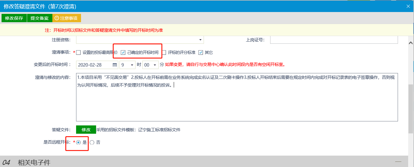 2、已經(jīng)發(fā)布招標(biāo)文件的項(xiàng)目需發(fā)布答疑澄清文件,在“澄清事項(xiàng)”“已確定的開標(biāo)時(shí)間”選擇“是否遠(yuǎn)程開標(biāo)”的是,同時(shí)在答疑澄清欄目“澄清與修改的內(nèi)容”和答疑澄清文件中增加如下信息告知投標(biāo)人:(1) 本項(xiàng)目采用“不見面開標(biāo)”;(2)投標(biāo)人在開標(biāo)前需在業(yè)務(wù)系統(tǒng)完成實(shí)名認(rèn)證及二次刷卡操作(3)開標(biāo)結(jié)束后,投標(biāo)人需在規(guī)定時(shí)間內(nèi)完成對(duì)開標(biāo)記錄表的電子簽章,否則視為認(rèn)同開標(biāo)情況,后續(xù)不予受理對(duì)開標(biāo)情況的投訴。具體操作如下圖: